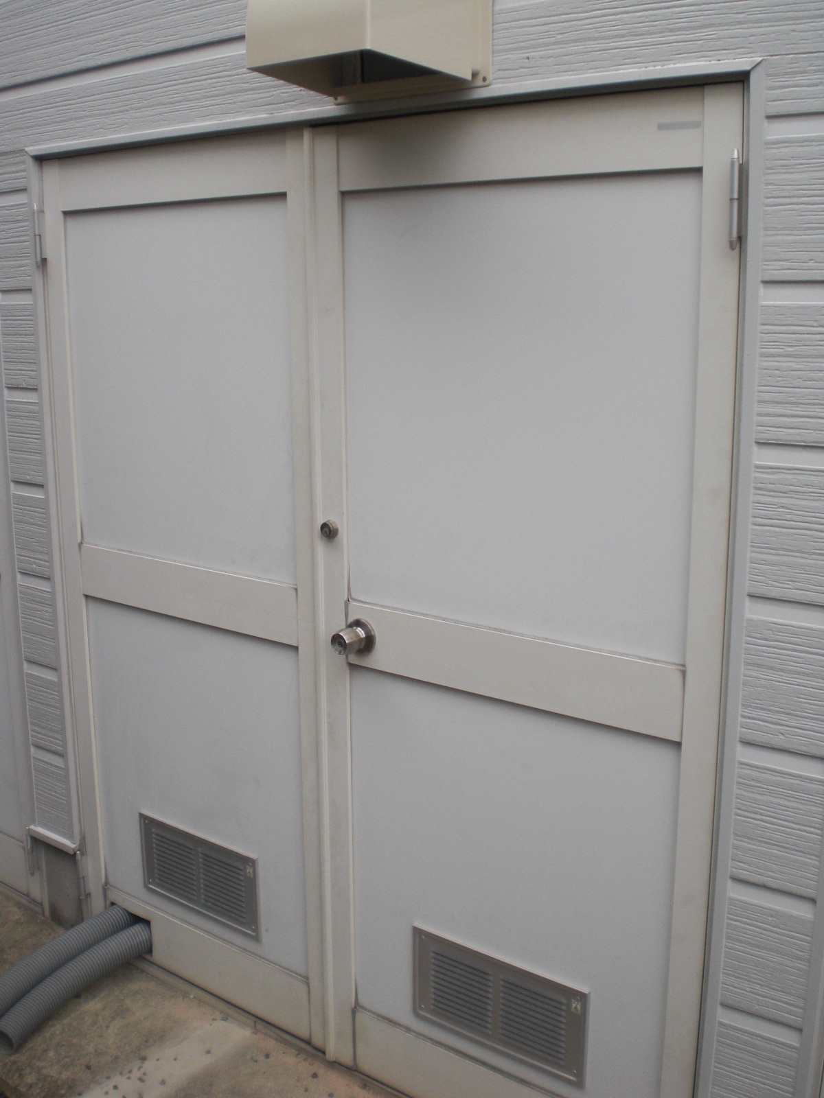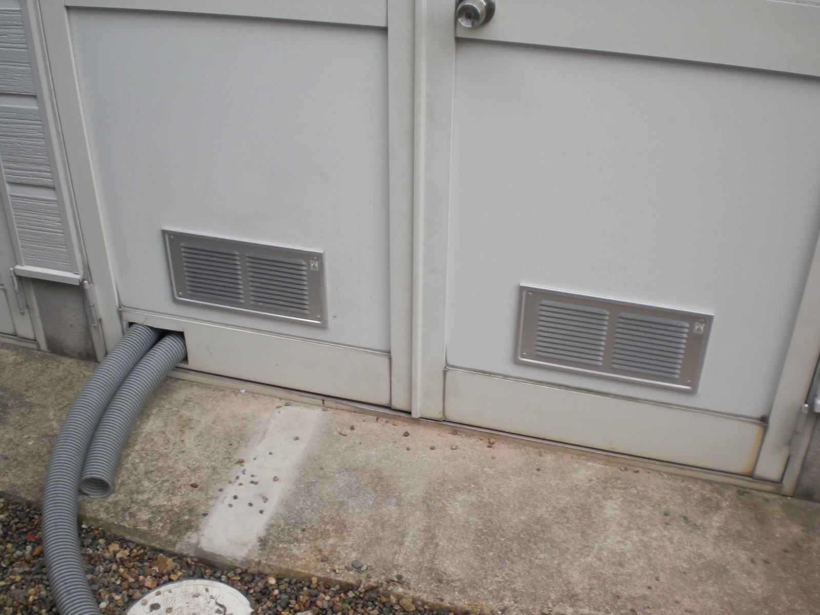 ②機械室のドアの下部に吸気のために換気ガラリを取り付け、上部に機械室の空気を抜くために換気扇を 取り付けました。