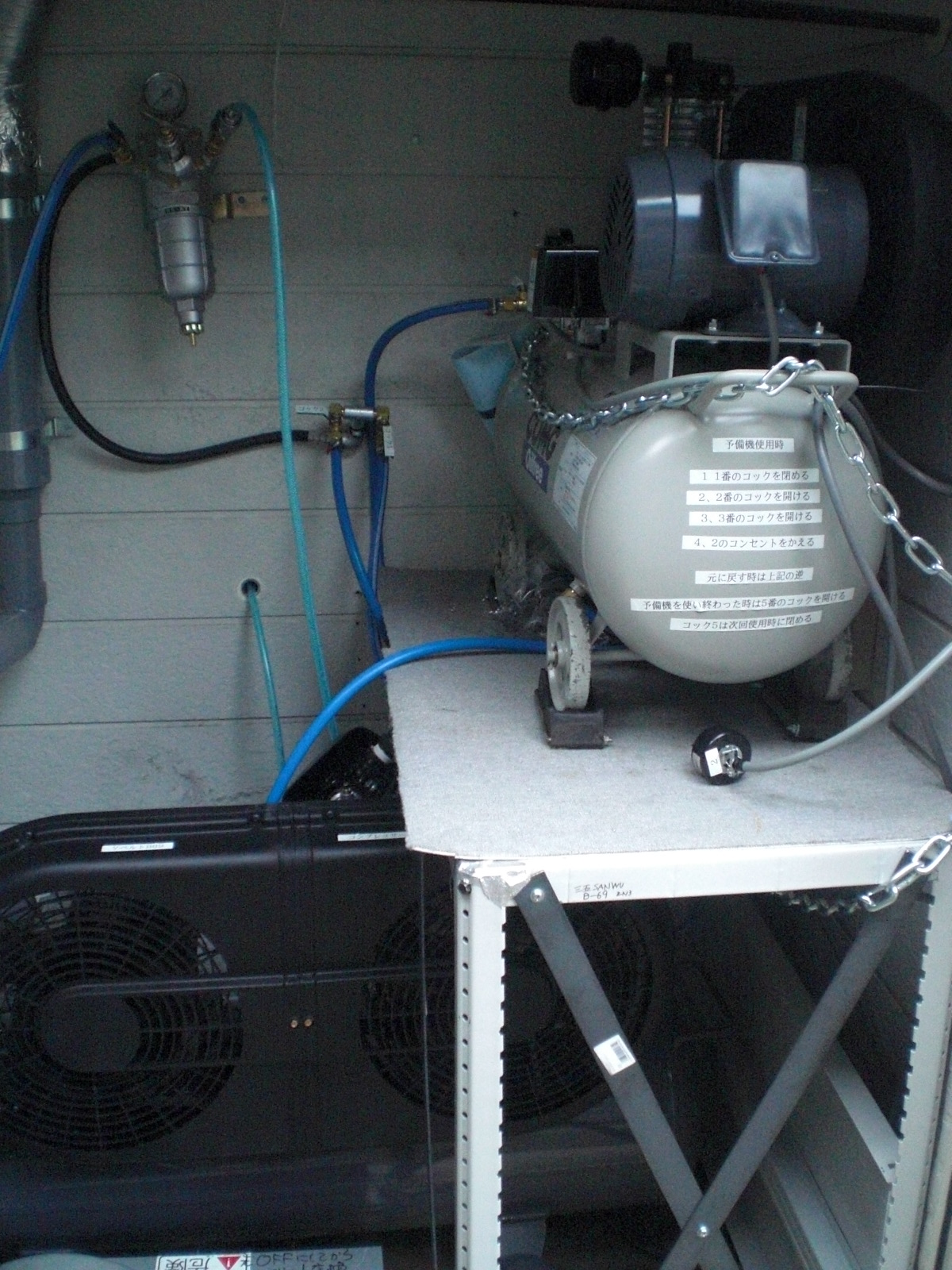 ①メインコンプレッサ-(アネスト岩田3馬力)、緊急用(アネスト岩田1馬力)の設置